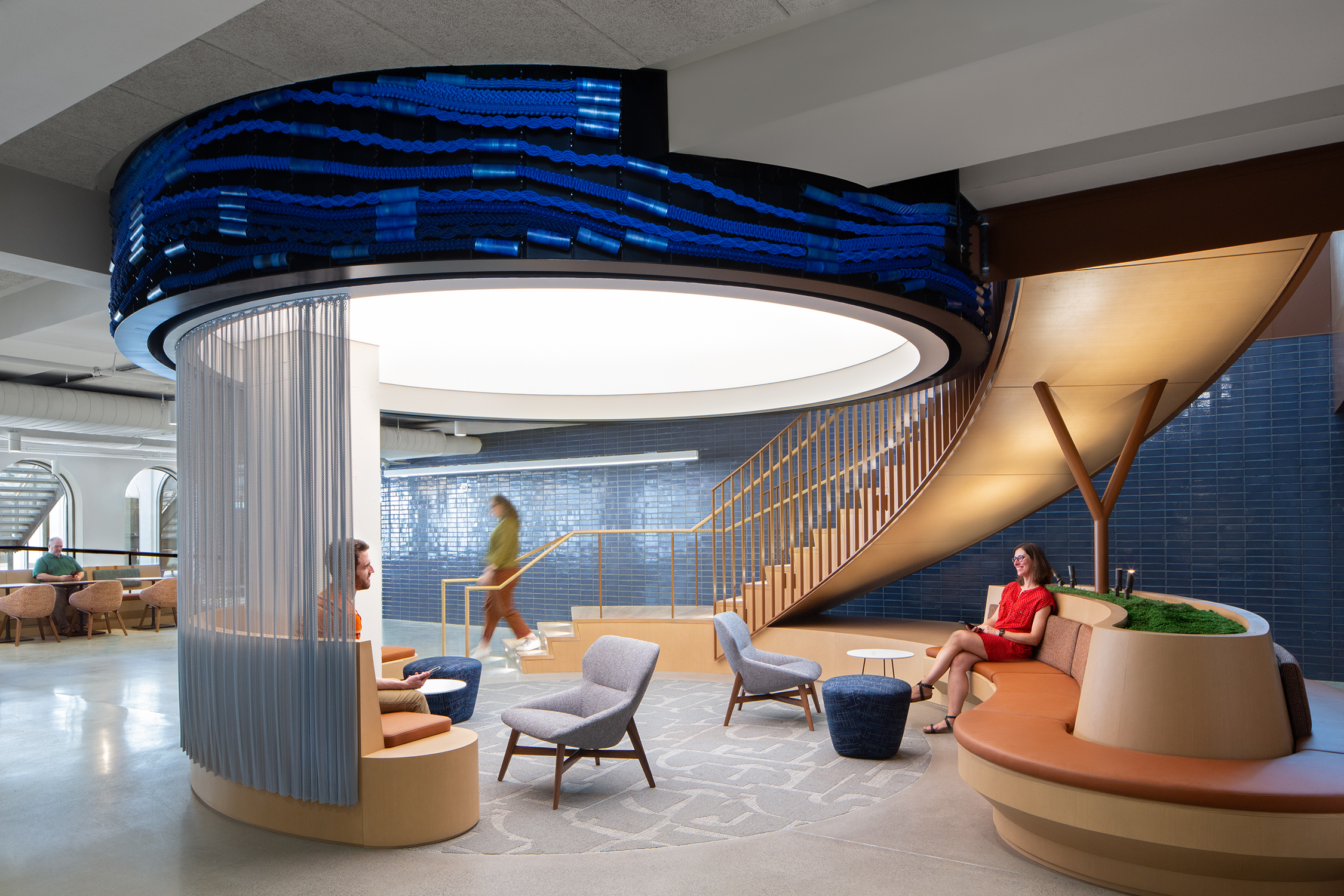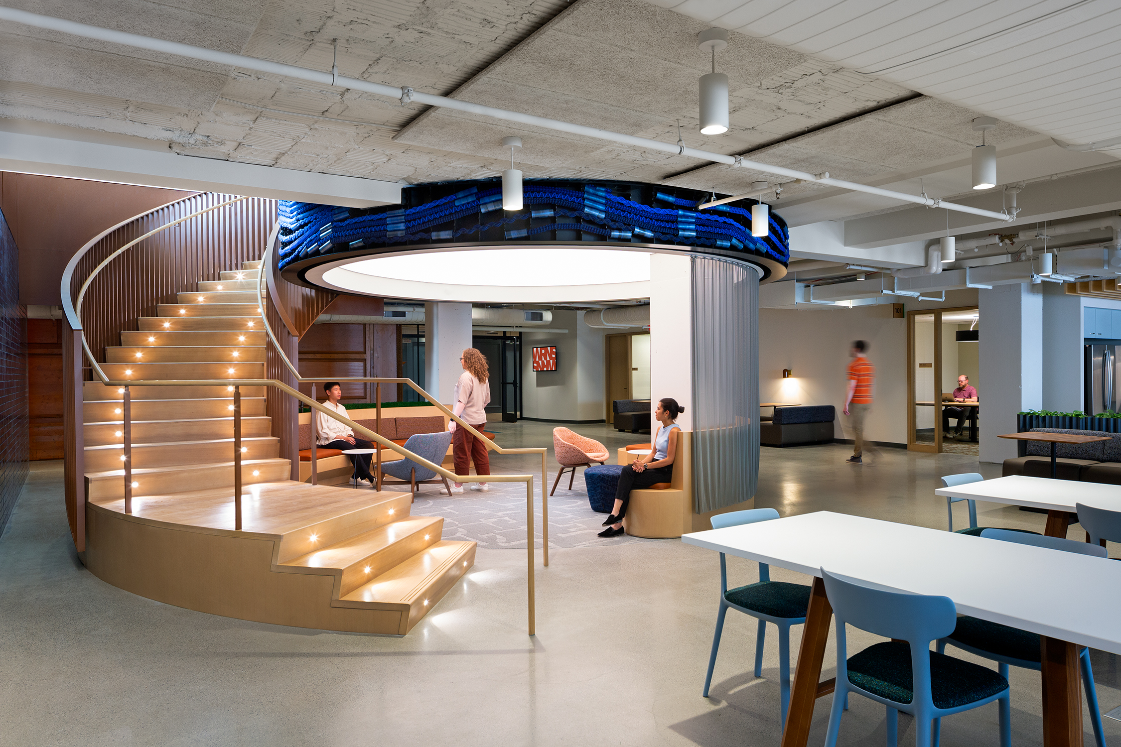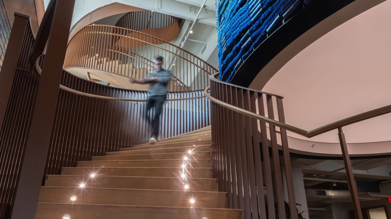 The curved feature stair on this project included multiple finishes: concrete treads, millwork cladding, and integral lighting.