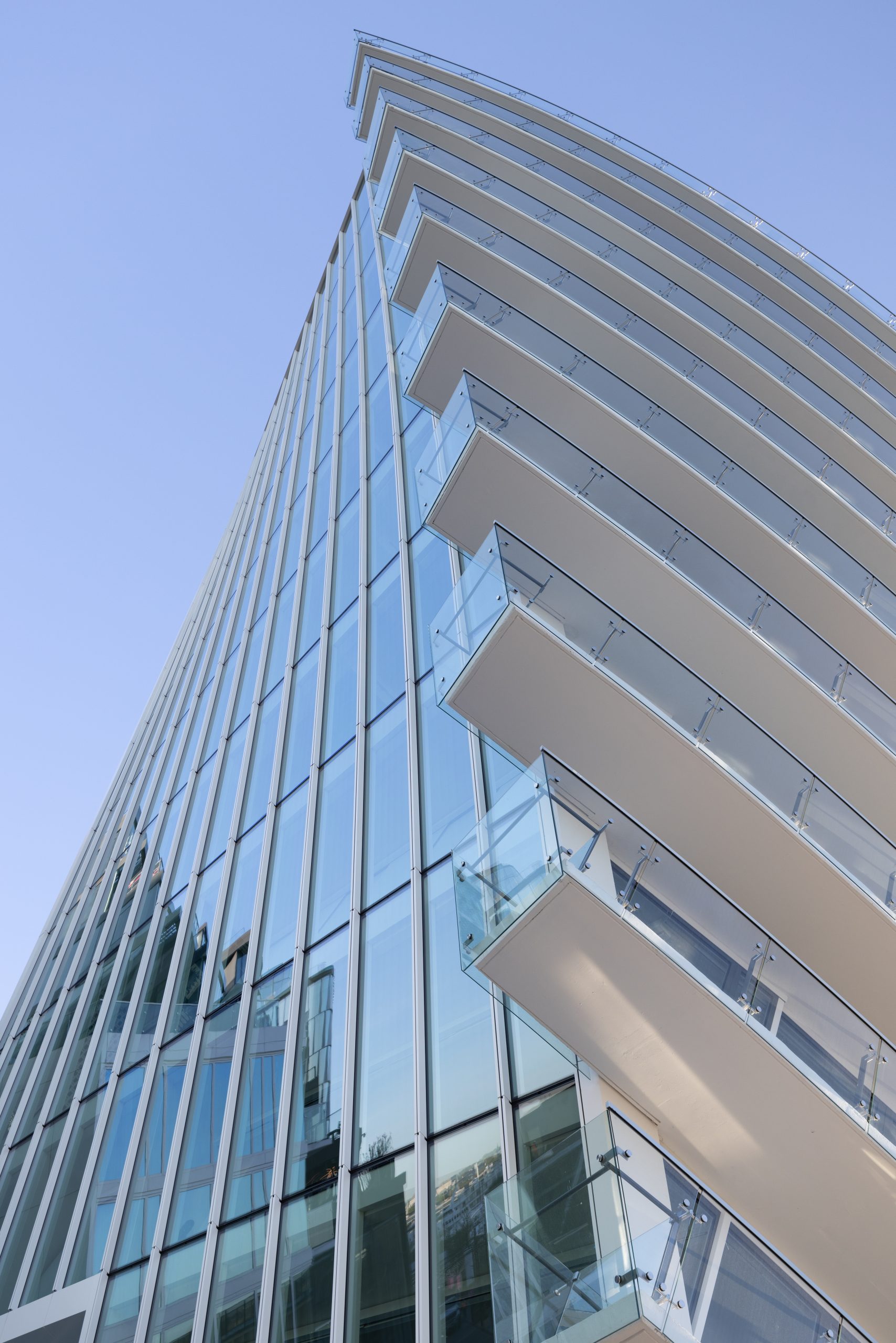 Synergi's curved glass guardrail system along 96 continuous balconies facilitates unobstructed views out of the unit. The largest residences are situated along the north and south ends of the tower, with their dramatically sloped glazing and views of the Potomac river, Washington Monument, and Jefferson Memorial.