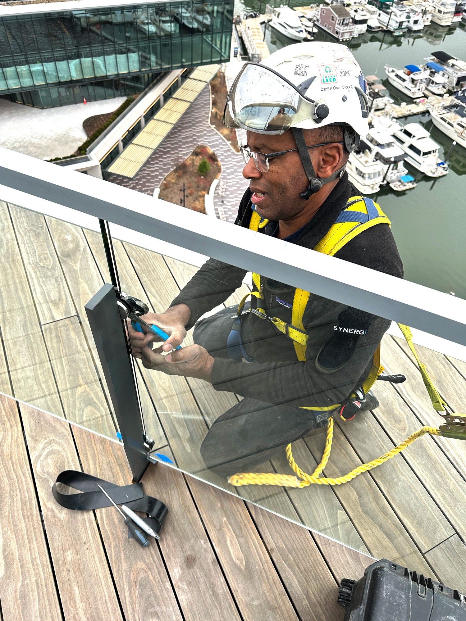 Synergi's curved glass guardrail system along 96 continuous balconies facilitates unobstructed views out of the unit. The largest residences are situated along the north and south ends of the tower, with their dramatically sloped glazing and views of the Potomac river, Washington Monument, and Jefferson Memorial.