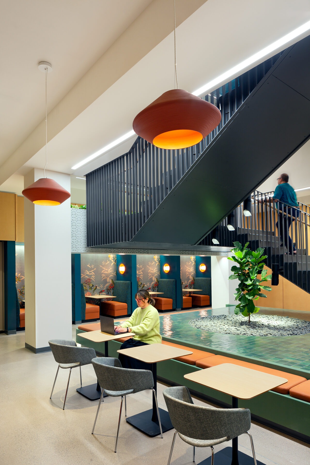 The centerpiece of the project—connecting old with new, daylight to each workspace, and employees with one another—is a grand stair that stretches from the second floor to the rooftop courtyard. This nine-story monumental stair unifies the former department store and connects the building internally with the neighboring Dreicer Building, also renovated as part of the project. Capped by a transparent lantern, the staircase repeats the footprint of the rooftop courtyard to channel natural light into the deep floorplates and to encourage employees to move about the building. This intervention supports Amazon’s goals for energy efficiency, minimized carbon, and employee well-being. The elegant black staircase recalls Manhattan’s ubiquitous fire escapes, a beautiful detail rooted in place.