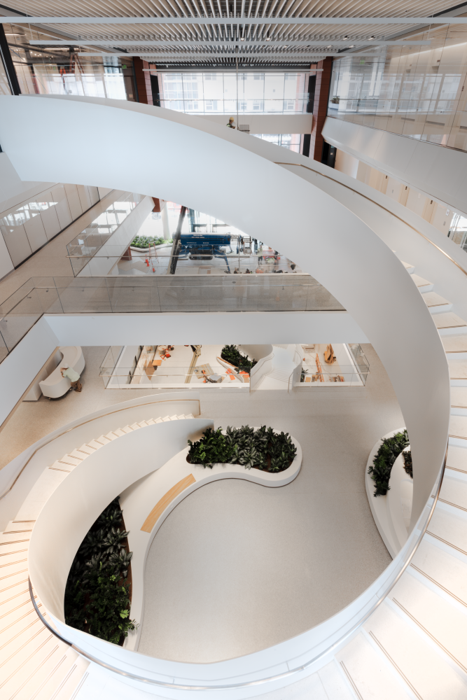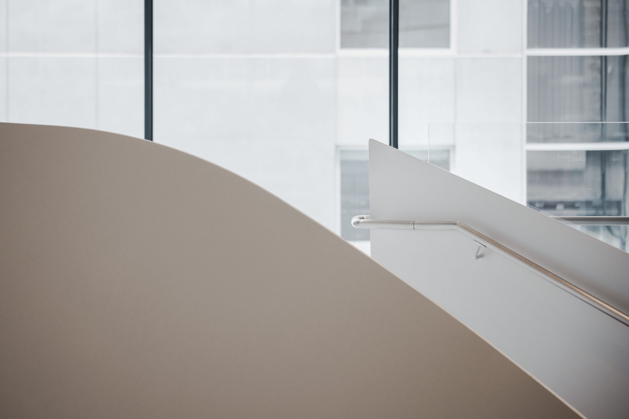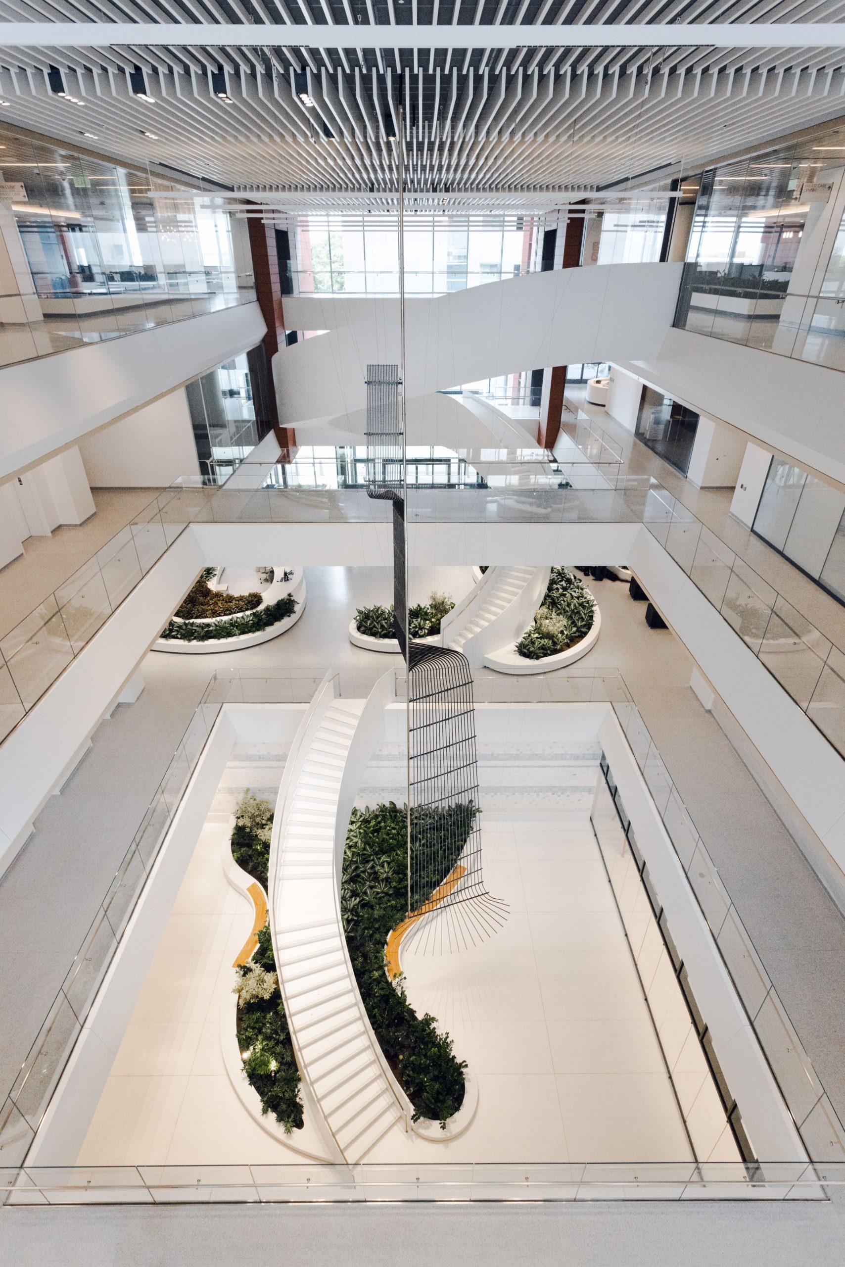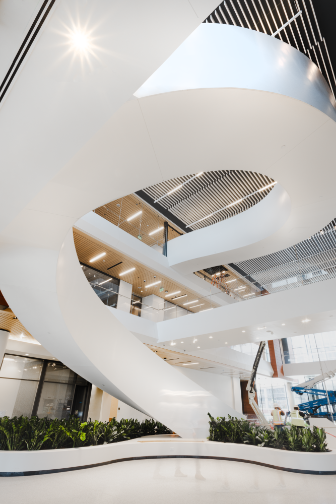 The main feature of the atrium is a winding stair connecting 4 floors that form a shape similar to the well-known cancer ribbon. Synergi collaboratively designed the unique stair with HOK where the ½” steel plate guardrails are the main structural member of the stair.