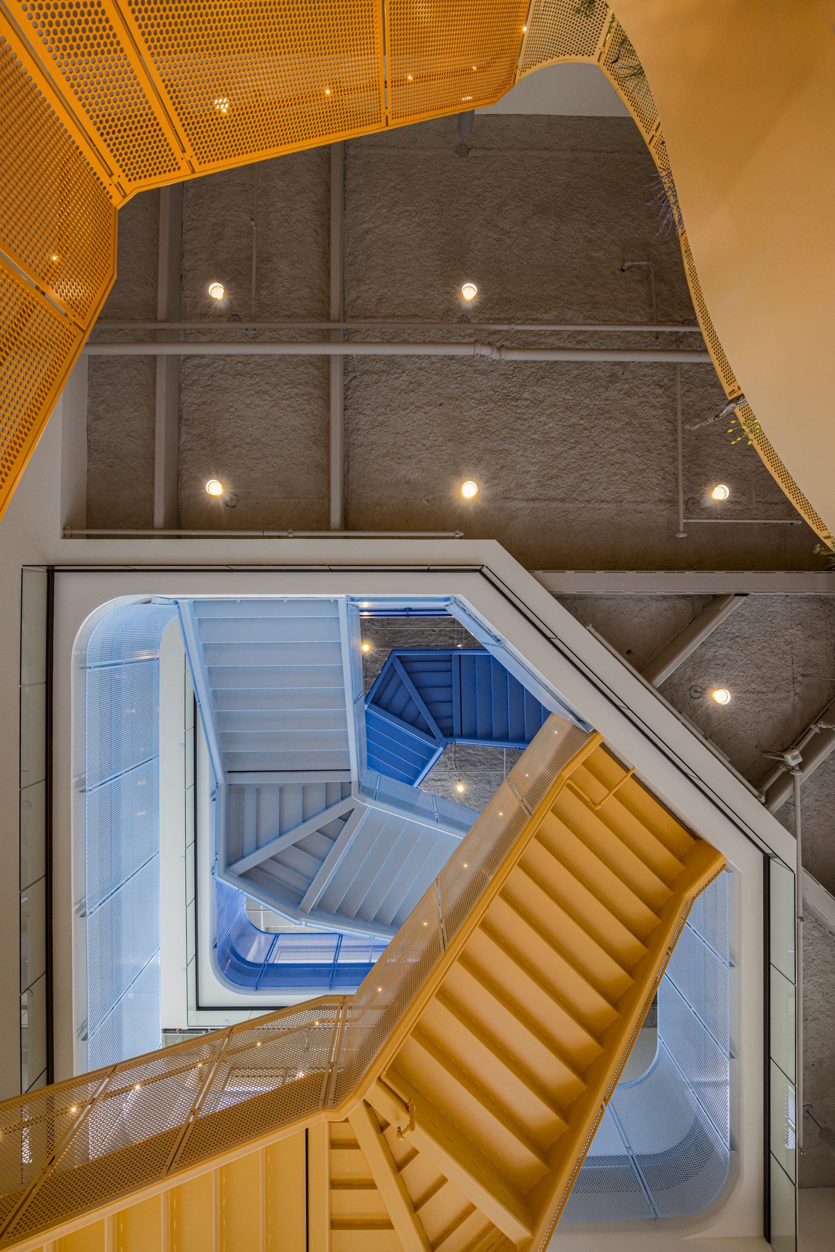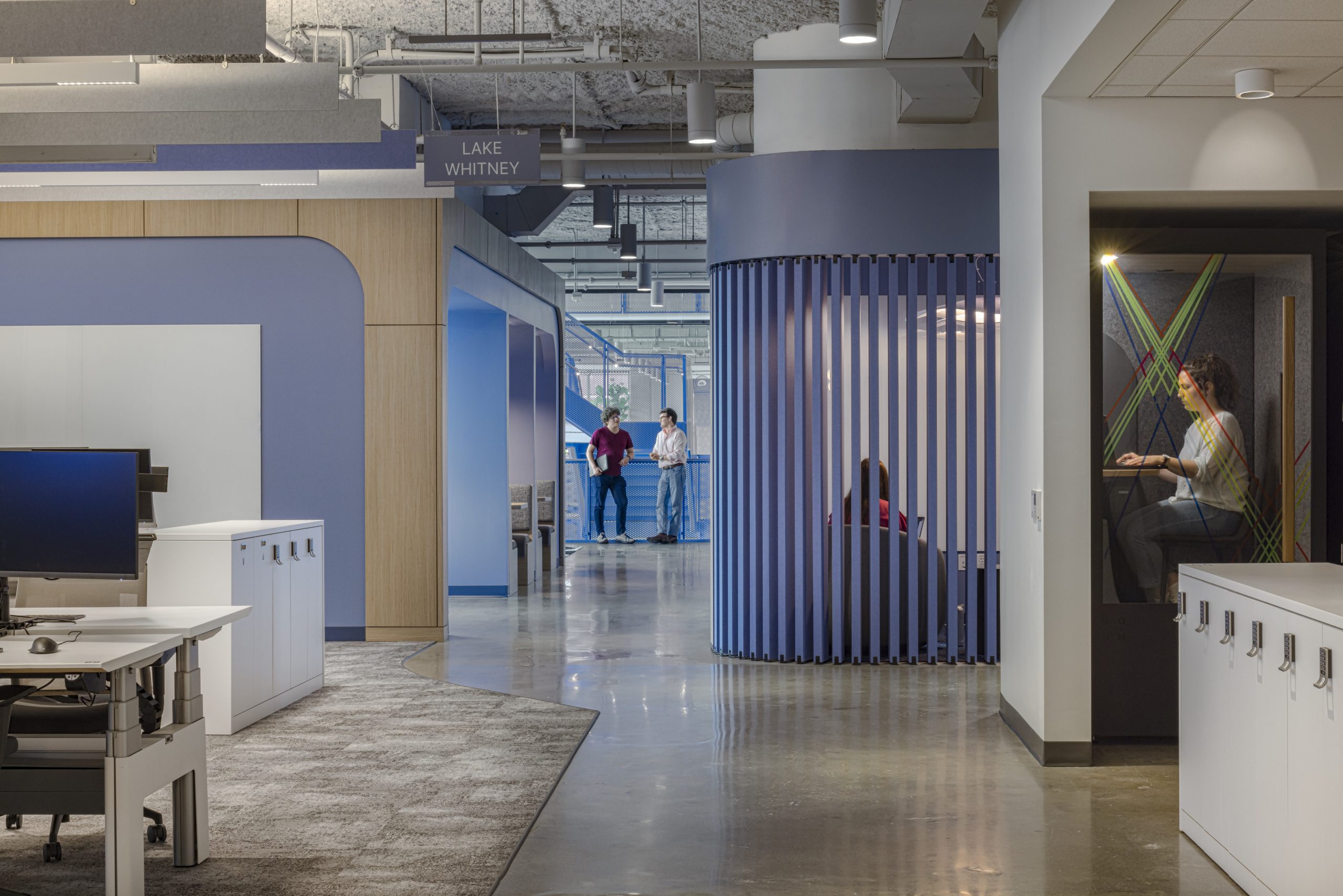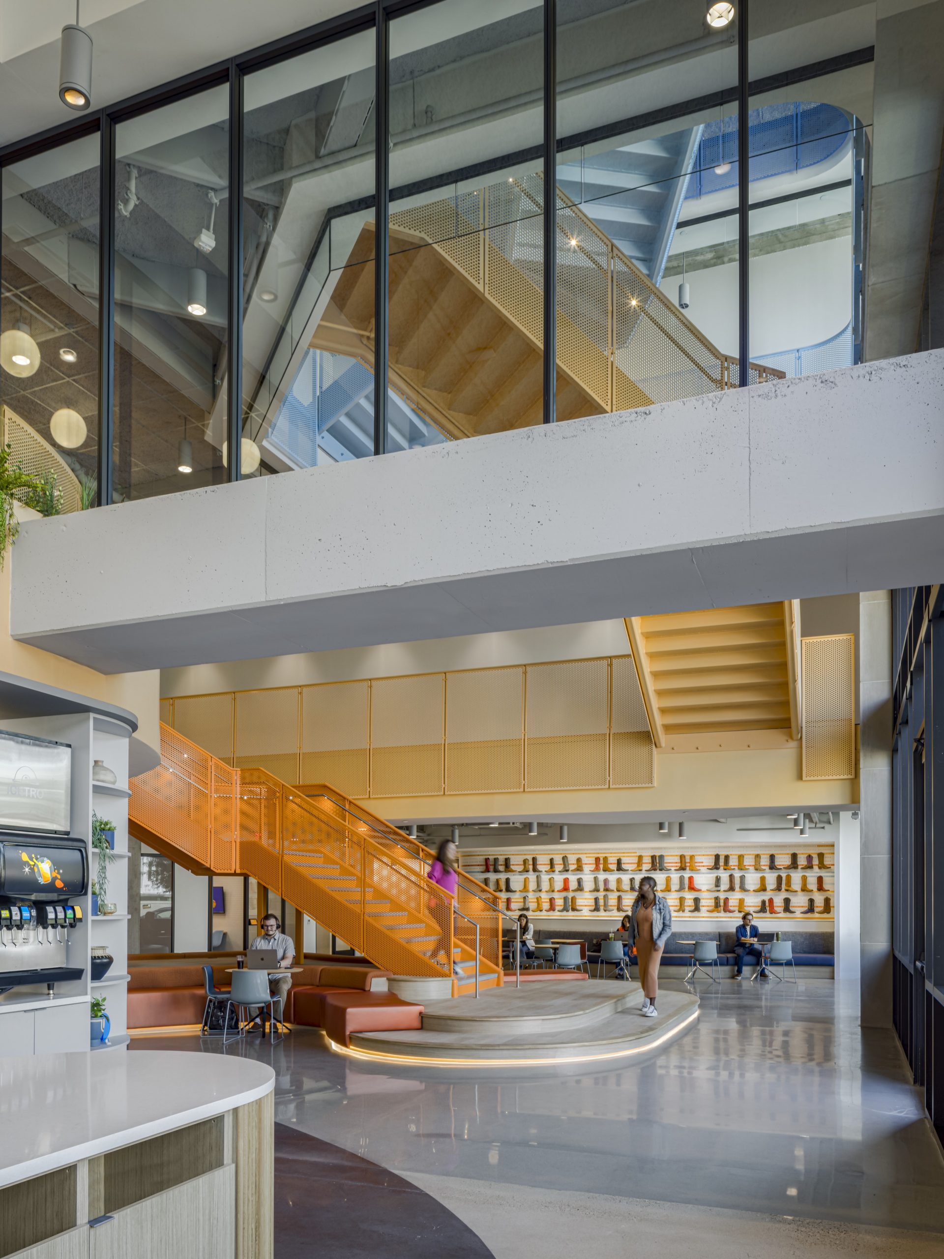 Variety on every floor works together to maximize social engagement at our clients Austin offices. The space begins with a convivial and interactive ground level, gradually ascending to unveil contemplative and concentration-enhancing spaces for individual and collaborative work. The central staircase with a color gradient inspired by the Belt of Venus (and Austin's beautiful sunsets) reinforce connection and a sense of place.