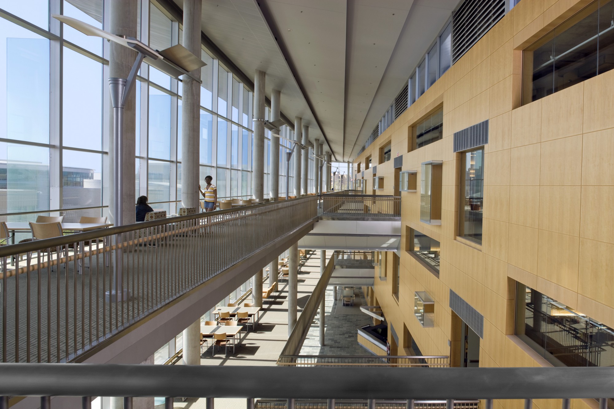 To the east, the building serves to strengthen and animate the pedestrian mall with a broad glass curtain wall featuring Synergi's exposed feature stair that gives a sense of openness and animation—underscoring the library as the new epicenter of campus.